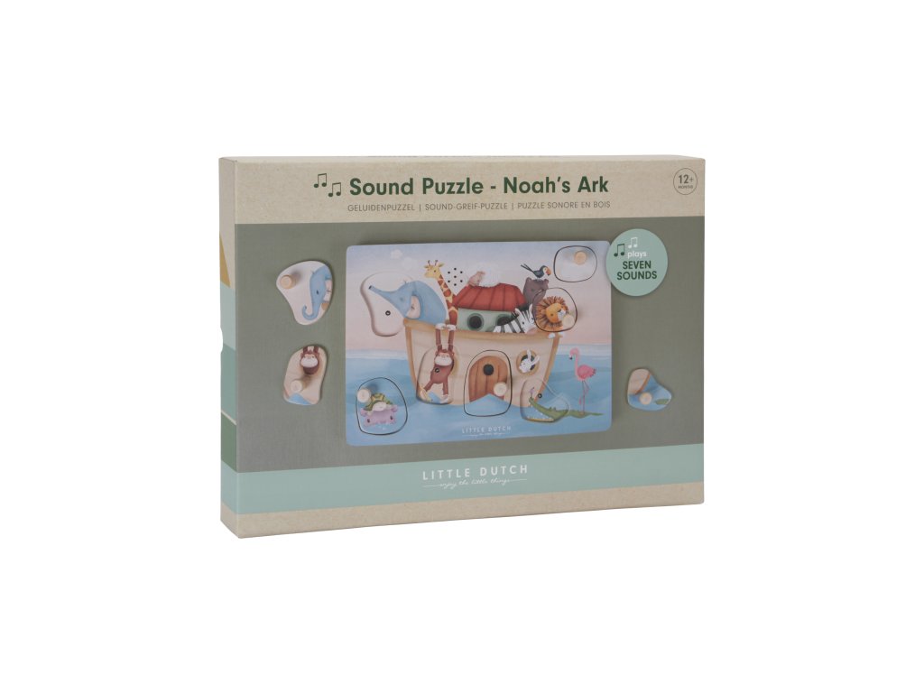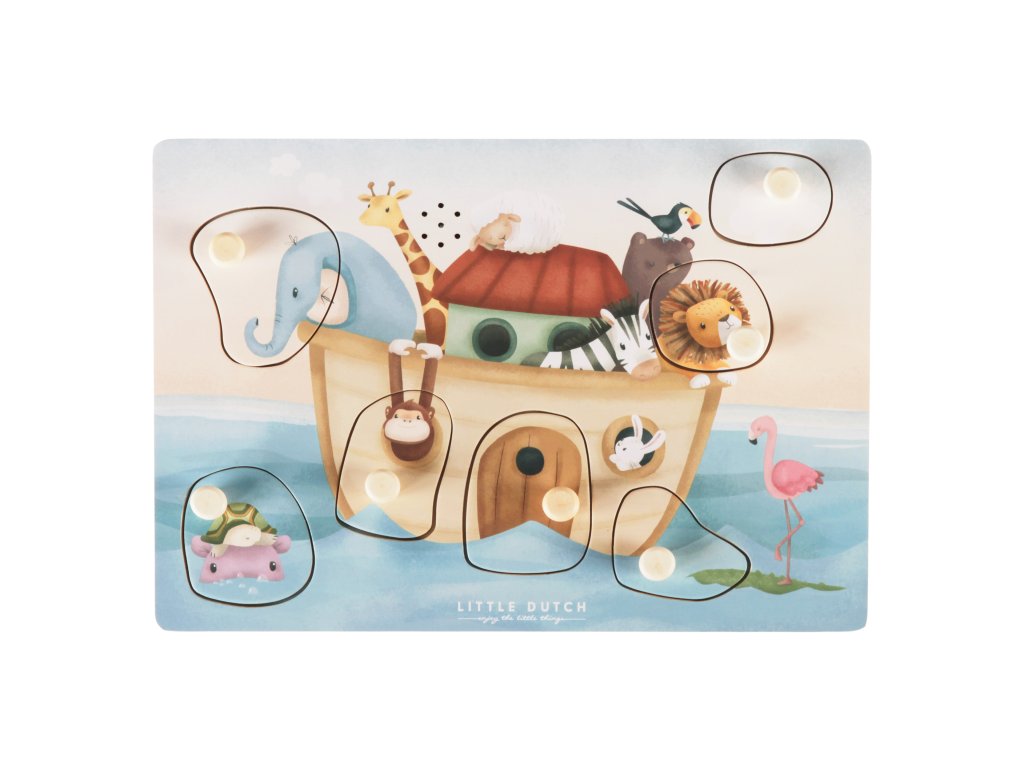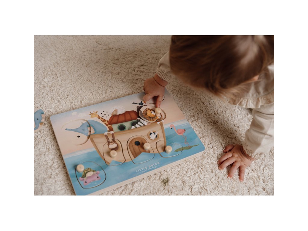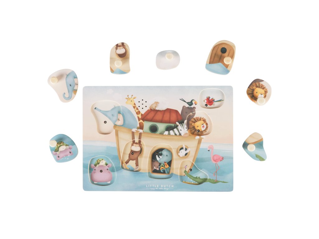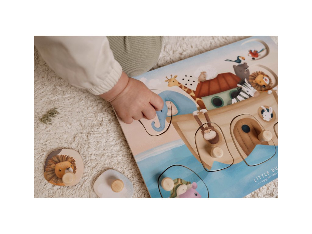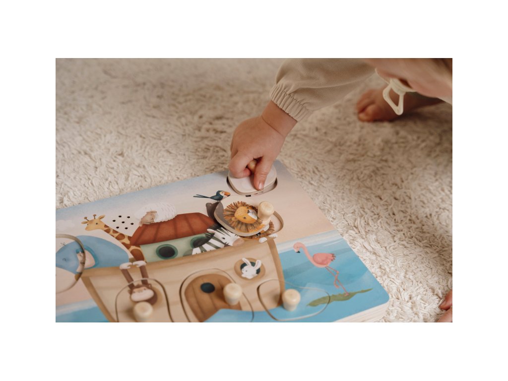Poznávajte spolu s vašim dieťaťom, ktoré zvieratá plávajú na Noemovej arche a aké zvuky vydávajú. Keď dieťa vloží správny tvar do otvoru na hernej doske, ozve sa napr. hlas slona či leva alebo bublanie pod hladinou.
