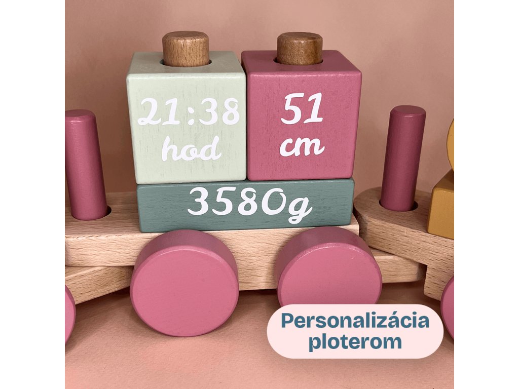 Napíšte meno a všetky údaje, ktoré ručne prenesieme vo forme špeciálnej bielej samolepky. Každý nápis je profesionálne vyrezaný plotrom, dokonale prenesený na drevo a precízne uhladený, aby na vláčiku pôsobil prirodzene a jemne doladil dizajn.
