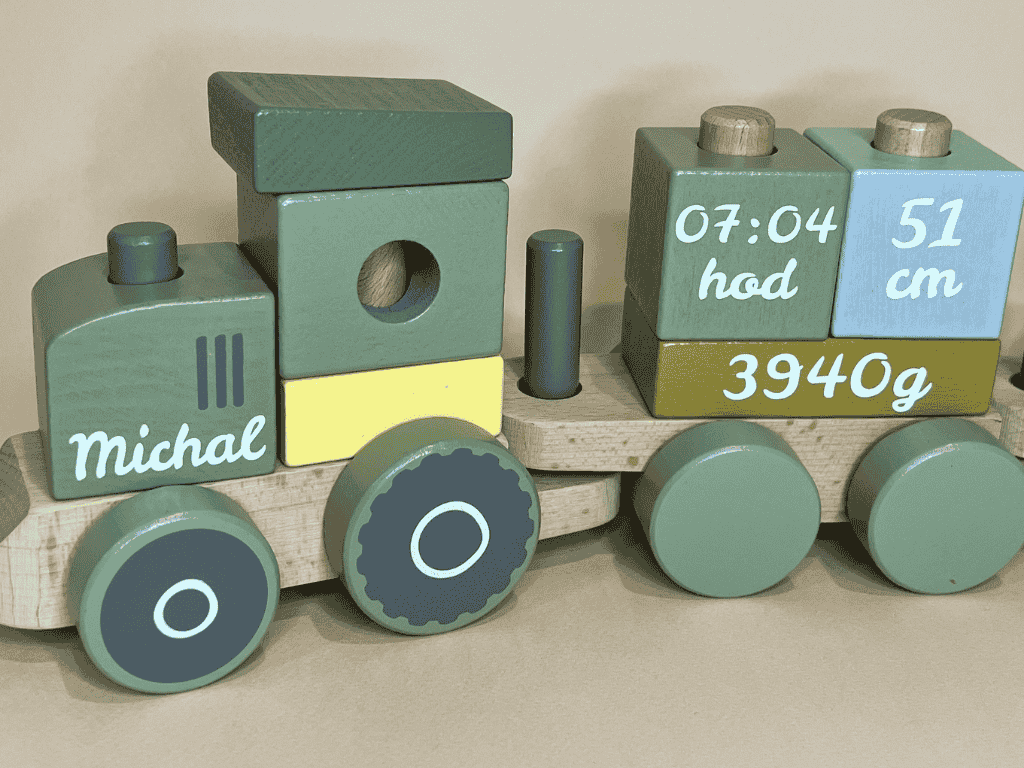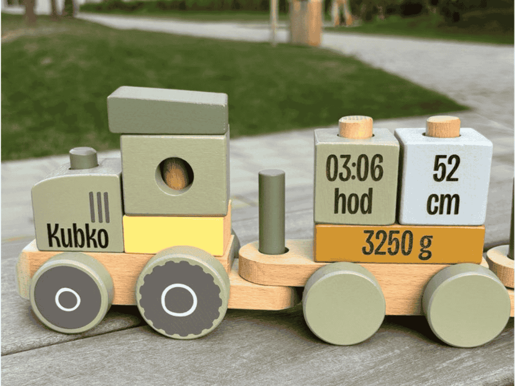 Pre tých, ktorí chcú niečo naozaj trvácne a elegantné, ponúkame aj gravírovanie priamo do dreva. Moderný laserový stroj vygravíruje každé meno a údaje s úplnou presnosťou do kociek vláčika. Nápis sa stane navždy súčasťou hračky – vďaka tomu bude vláčik nielen krásny, ale aj hodnotným spomienkovým predmetom na celé detstvo.