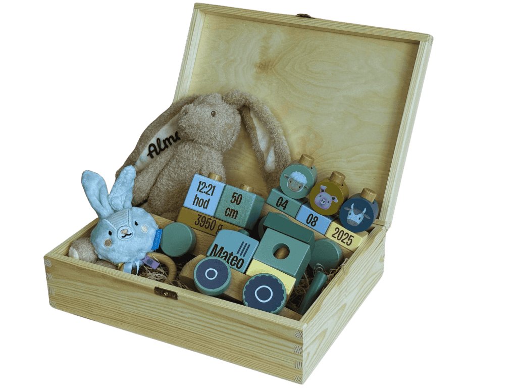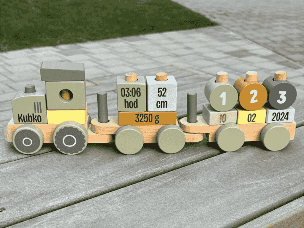 Pre tých, ktorí chcú niečo naozaj trvácne a elegantné, ponúkame aj gravírovanie priamo do dreva. Moderný laserový stroj vygravíruje každé meno a údaje s úplnou presnosťou do kociek vláčika. Nápis sa stane navždy súčasťou hračky – vďaka tomu bude vláčik nielen krásny, ale aj hodnotným spomienkovým predmetom na celé detstvo.