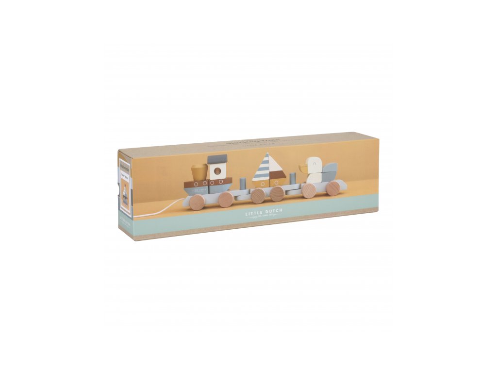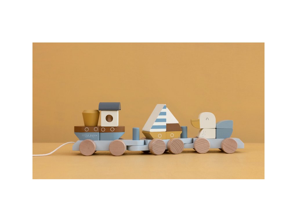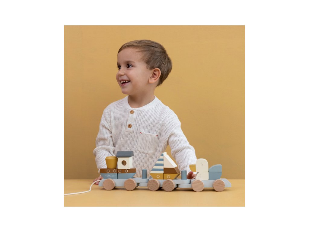 Tento drevený vlak vedený rybárskou loďou je na ceste do námorníckeho zálive. Použite svoju predstavivosť a postavte vlak pomocou skladacích kociek v rôznych tvaroch a farbách inšpirovaných prístavom. K dispozícii sú 3 vagóny s rybárskou loďou, plachetnicou a čajkou.