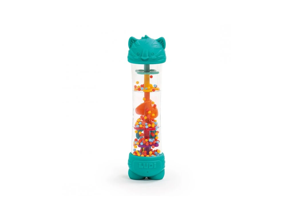 Hrkálka s korálkami dažďová palička je senzorická hračka pre deti od 6 mesiacov, ktorá kombinuje jemný upokojujúci zvuk, vizuálnu zábavu aj hryzátko pre obdobie rastu zúbkov. V priehľadnom tubuse sa pri otáčaní hračky pomaly presýpajú farebné guličky a vytvára príjemný upokojujúci „dažďový“ zvuk. Dieťa zároveň vidí pohyb guličiek a postupne chápe súvislosť medzi vlastným pohybom a výsledkom. Zakončenie hračky v podobe tigrie hlavy a nôh slúži aj ako hryzátka na úľavu citlivým detským ďasnám pri prerezávaní prvých zúbkov.