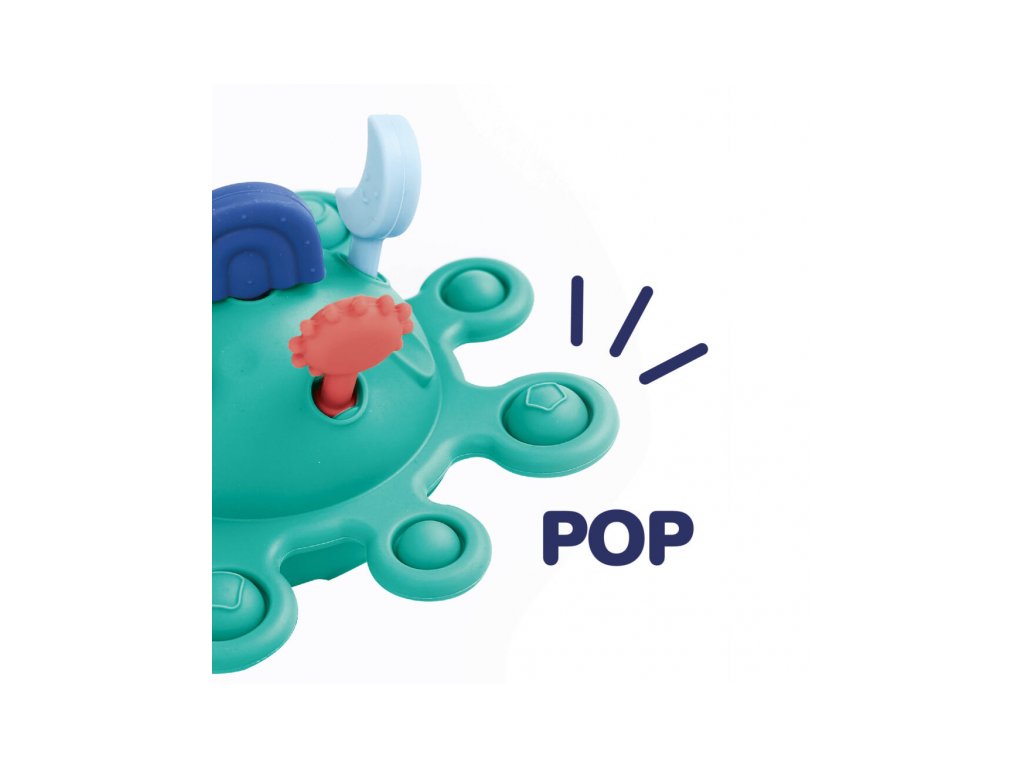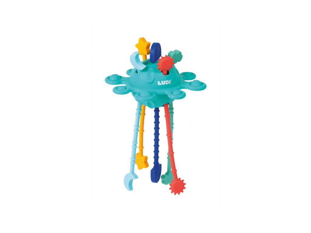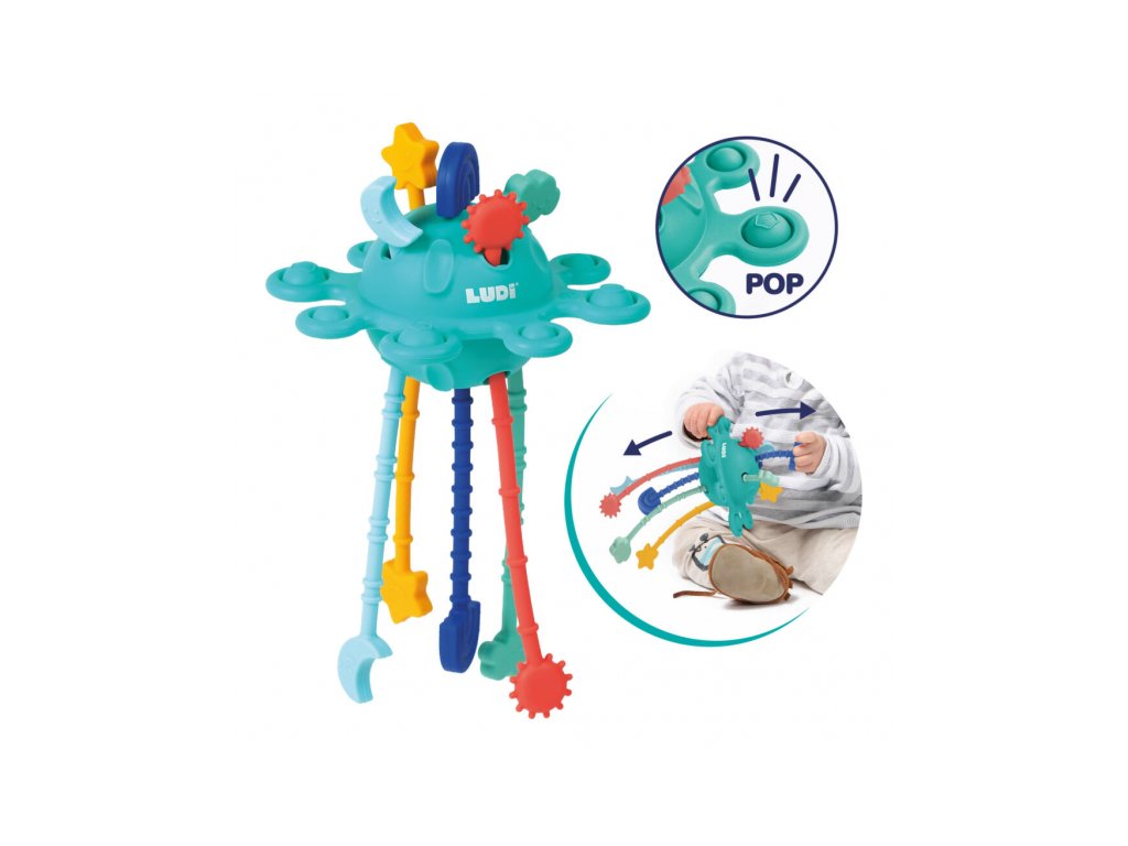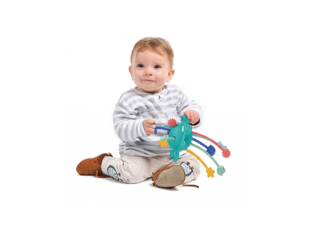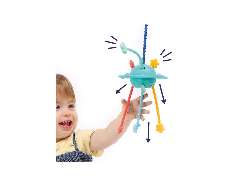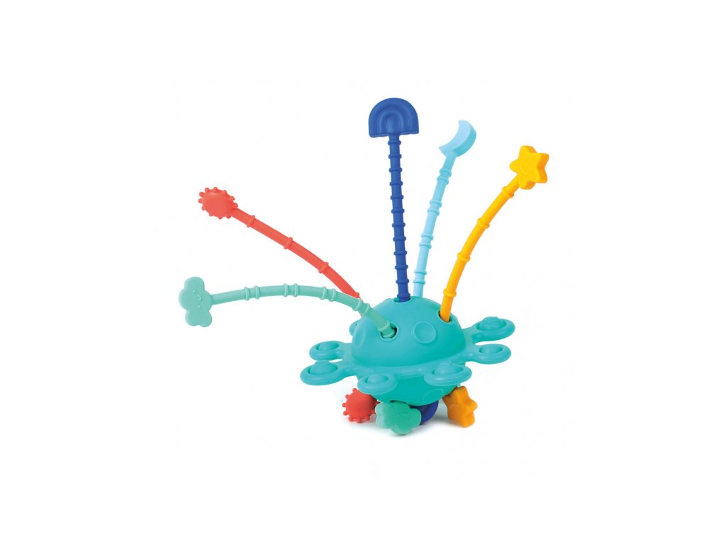 Originálna hrkálka z príjemného, mäkkého silikónu zaujme svojim unikátnym prevedením v podobe pohyblivých hadičiek s rôznymi textúrami. Hadičky sa pohybujú oboma smermi v základni hračky a pritom vydávajú vďaka svojej textúre jemný drnčivý zvuk. Bublinky po obvode základne hračky pri stláčaní tiež produkujú jemný praskavý zvuk.