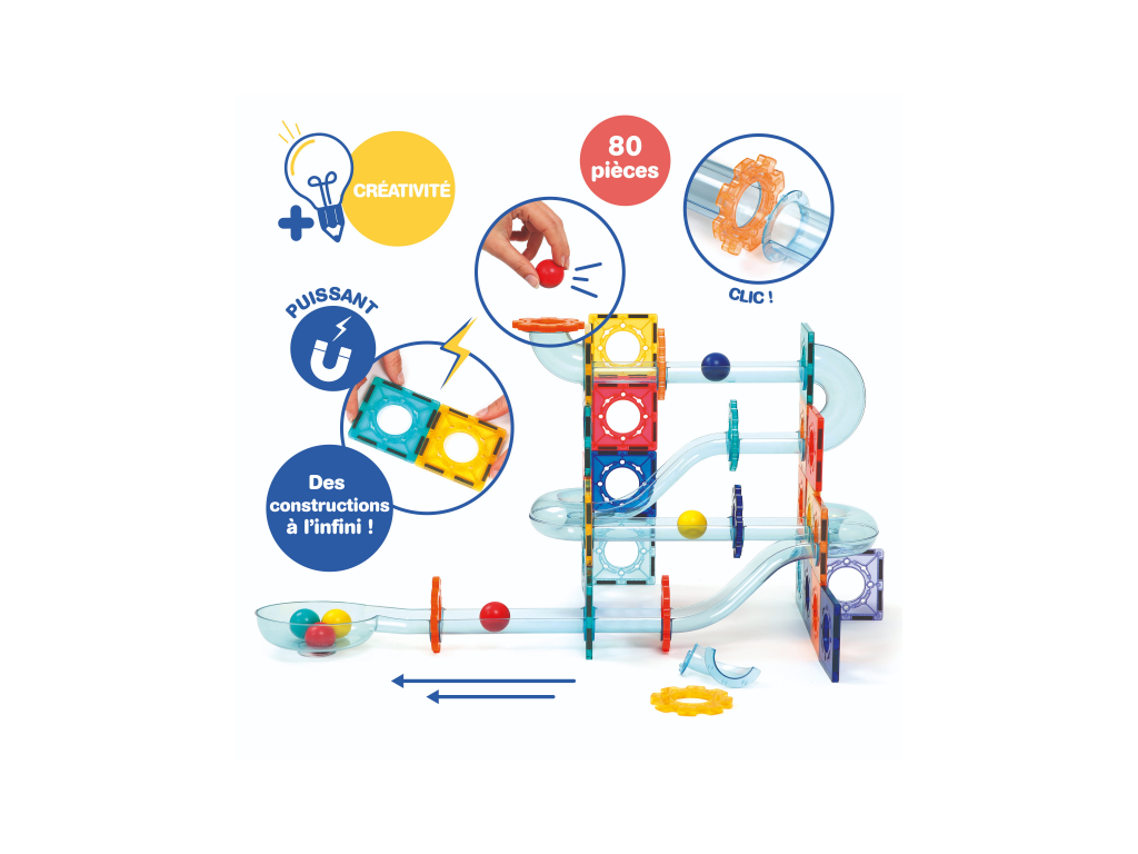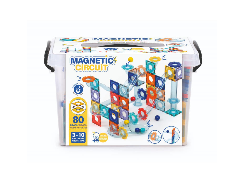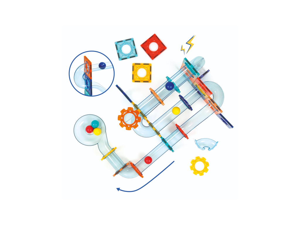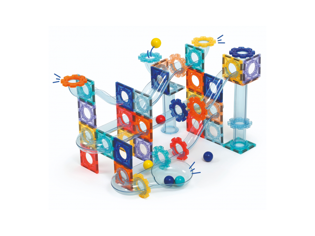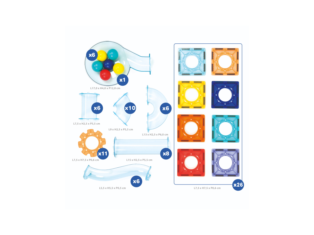 Obsah balení: 26 magnetických destiček, 48 dílů dráhy, 6 kuliček, úložný box