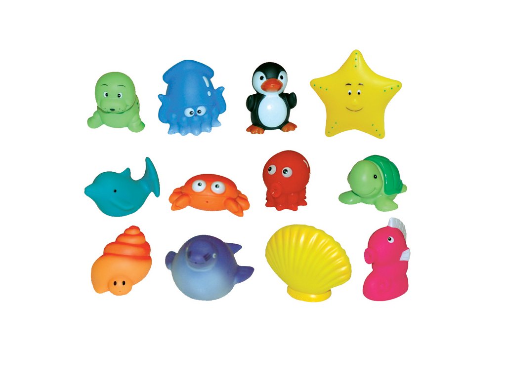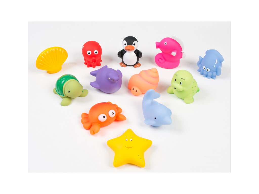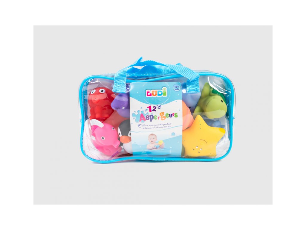 Sada 12 striekacích hračiek Ludi pre zábavu počas kúpania v praktickej úložnej taške. Vhodné od 10 mesiacov.