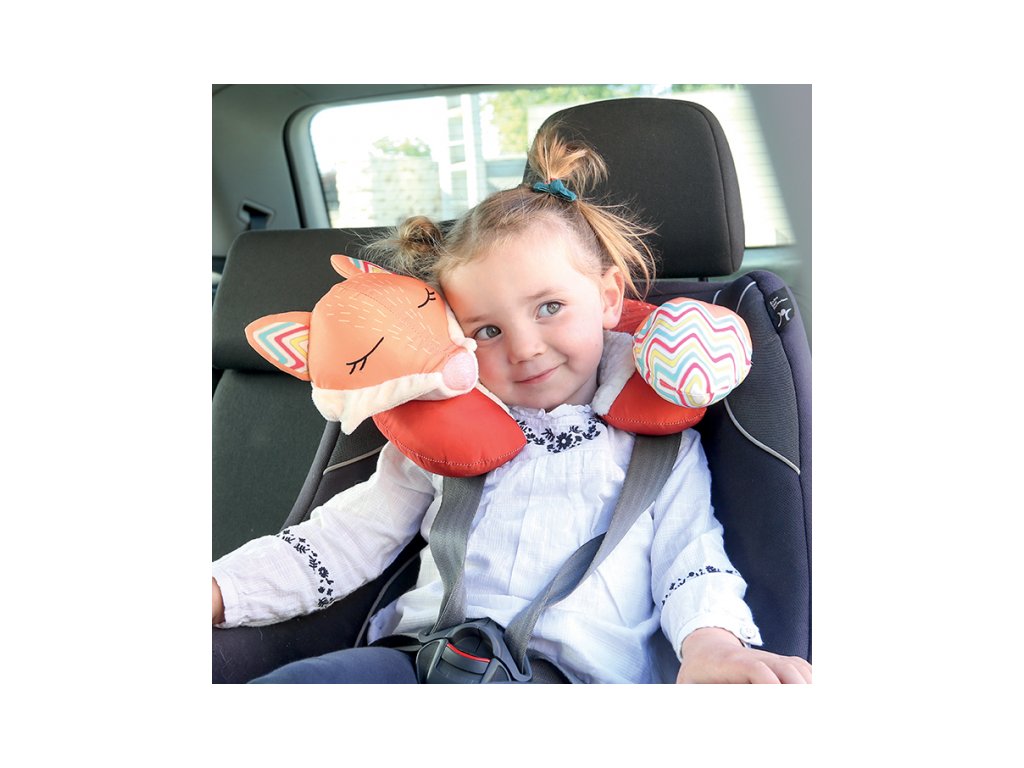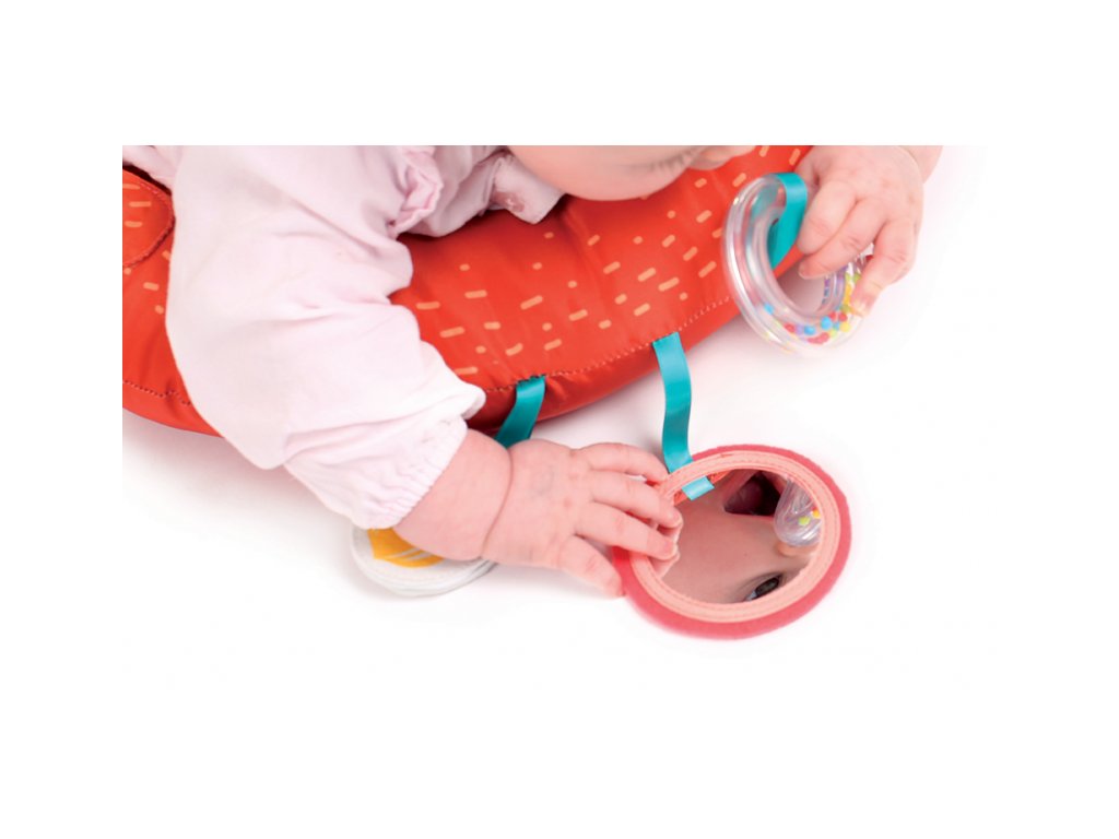 Vankúšik v podobe líšky z mäkkého, príjemného materiálu je špeciálne navrhnutý, aby podporoval hranie dieťaťa na brušku. Pozornosť dieťaťa upúta bezpečné zrkadlo, hrkálka, mini knižka s výraznými obrázkami i šuštiacou časťou.