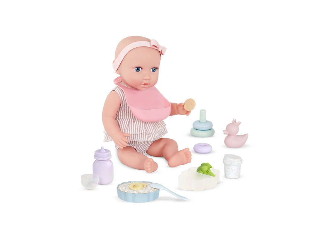S touto sadou doplnkov pre bábiku sa deti môžu postarať o nakŕmenie aj prebalenie svojej bábiky ako skutoční rodičia. Sada obsahuje podbradník, misku s jedlom (ovsená kaša, brokolica a sušienka), fľaštičku s mliekom, hrnček, lyžičku, 2 krúžky, hryzátko, kačičku, prebaľovaciu plienku, zásobník obrúskov a praktický úložný v tvare obláčika. Deti si môžu vyskúšať starostlivosť o bábätko, rozvíjať pritom jemnú motoriku, predstavivosť aj sociálne zručnosti.