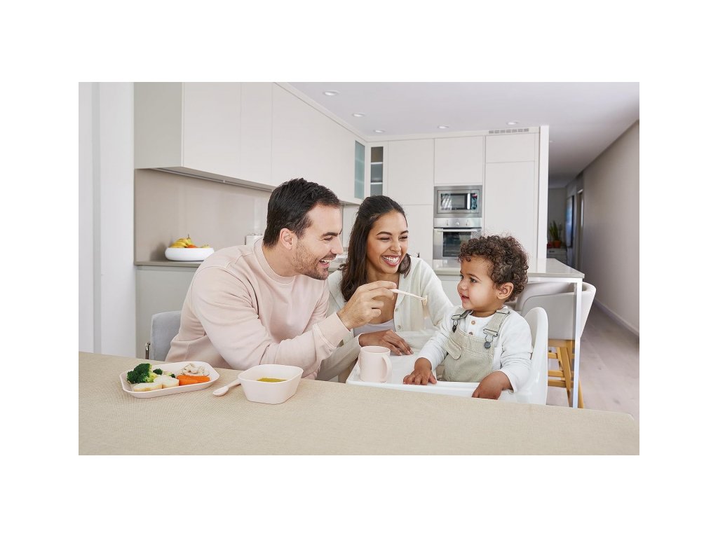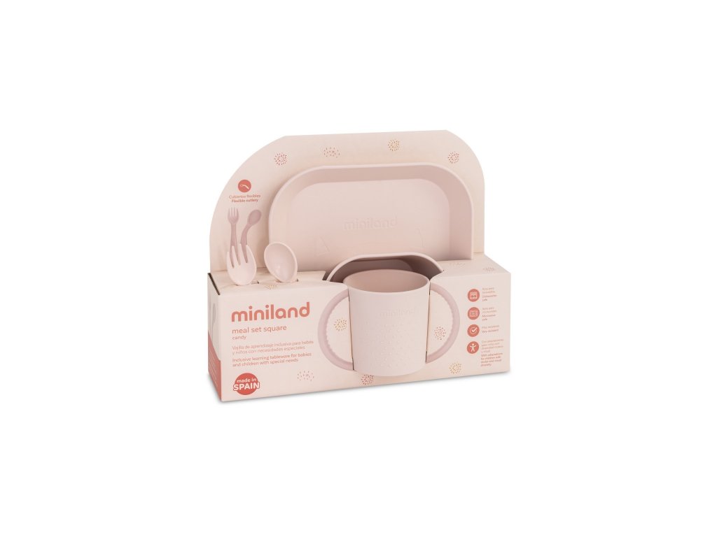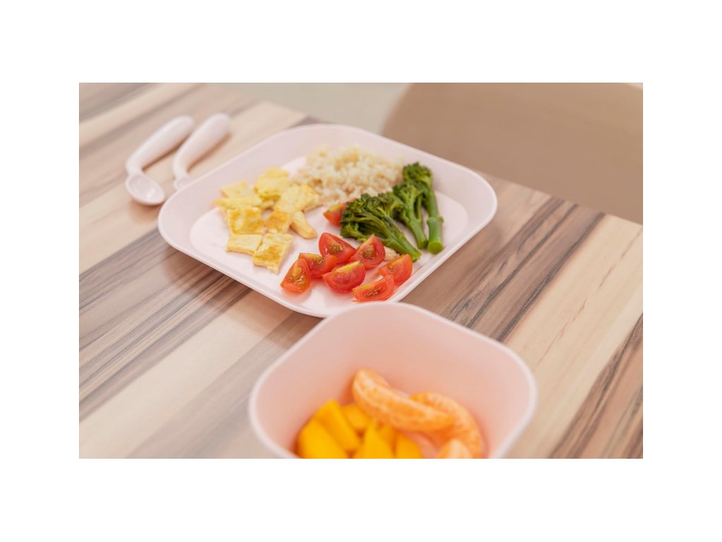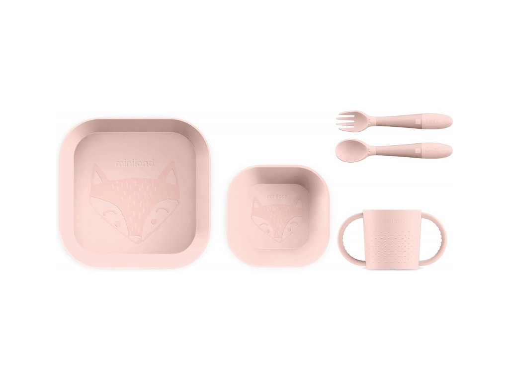 Jídelní sadu tvoří talíř, miska, hrnek se 2 uchy, pružná lžička a vidlička. Talíř i miska s vysokými okraji pomáhají snadnému nabírání pokrmu. Lžička a vidlička jsou vyrobeny z flexibilního příjemného materiálu a mají neklouzavá, kulatá držadla, která usnadňují dítěti držení. Hrnek se dvěma uchy pomáhá dítěti naučit se pít z klasického hrnku.