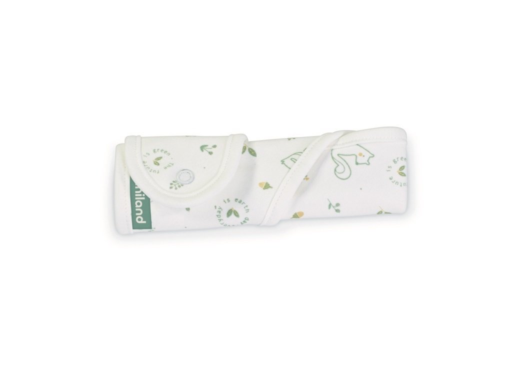 Lžička a vidlička mají zaoblené bezpečné tvary a kulatá držadla, která usnadňují dítěti držení. Bryndáček s něžným potiskem králíčků je na vnitřní straně vybaven kapsou, do které můžete vidličku a lžičku zabalit.