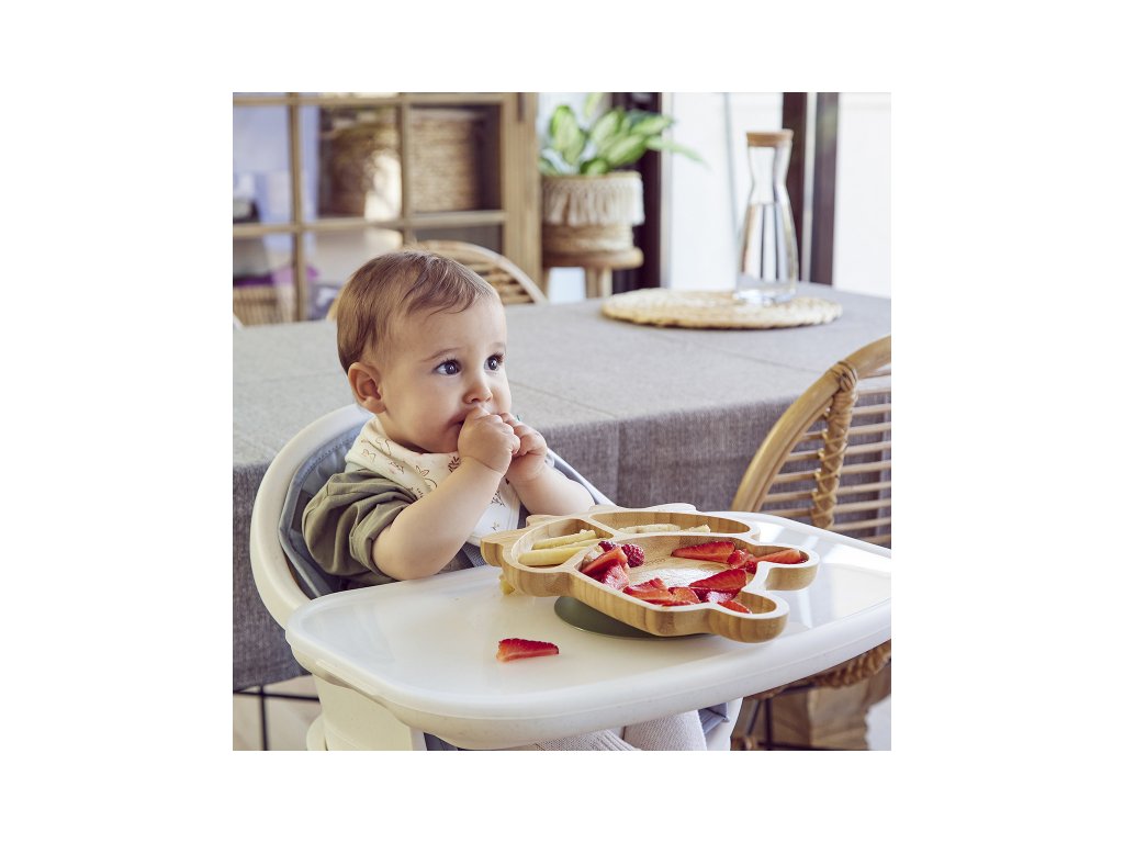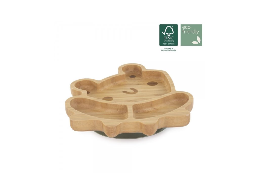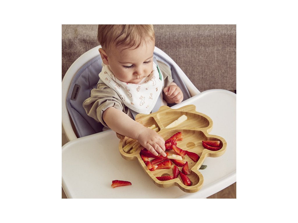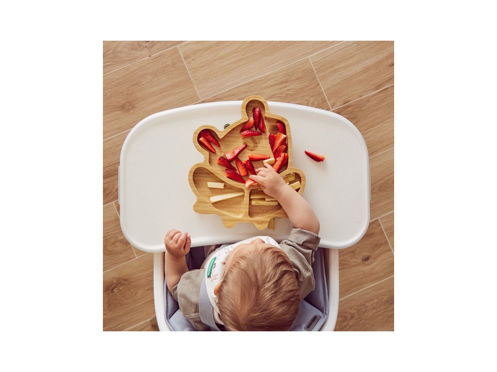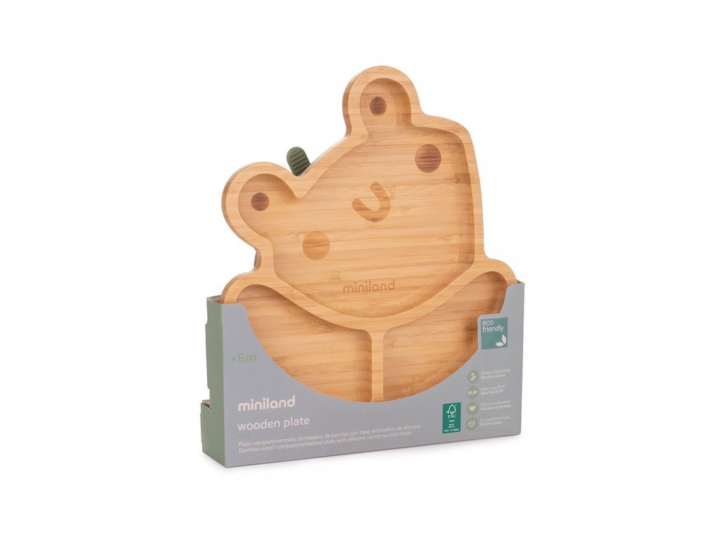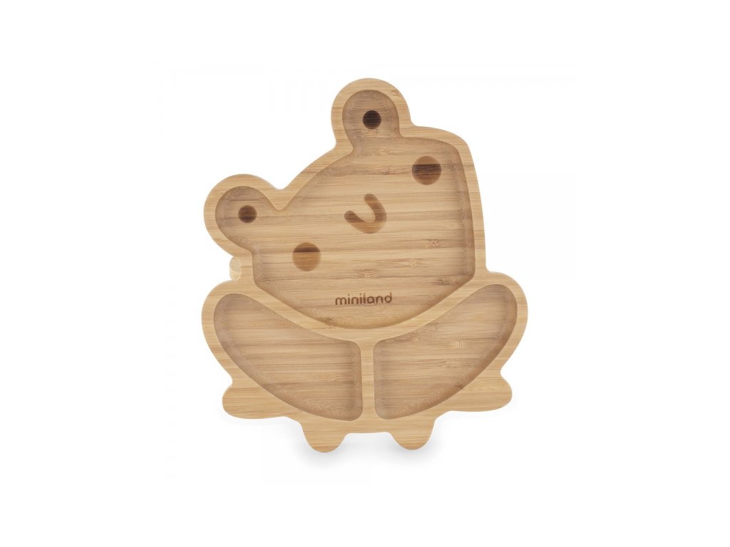 Dělený talíř v krásném provedení z bambusového dřeva ve tvaru žáby je vybaven odnímatelnou silikonou přísavkou, díky které neklouže po stole či jídelním pultu židličky. Talíř se třemi přihrádkami je ideální i pro BLW metodu, při které se strava nemixuje a dítě se krmí samo.