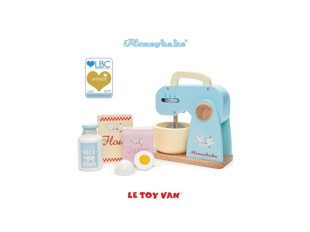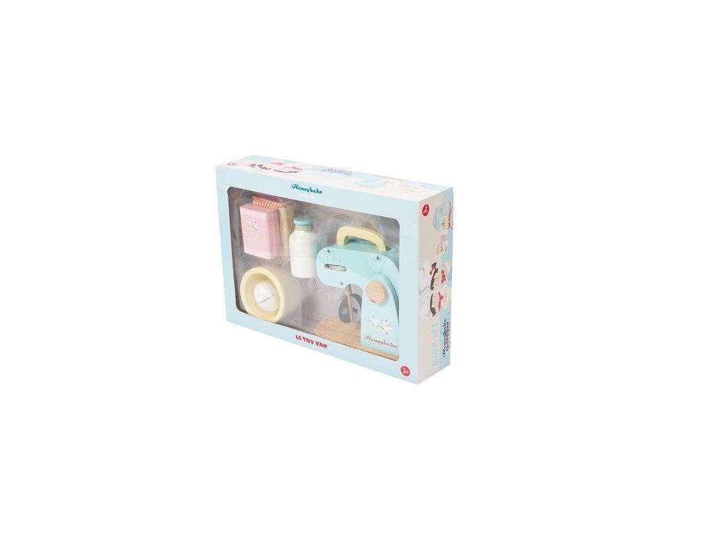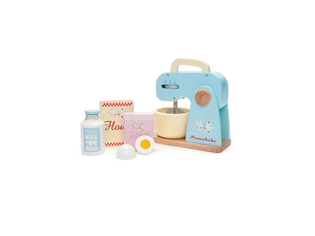 Drevený mixér set obsahuje všetko, čo k pečeniu sladkých dobrôt budete potrebovať: mixér s odnímateľnou miskou, vajíčko, mlieko, múku aj cukor.