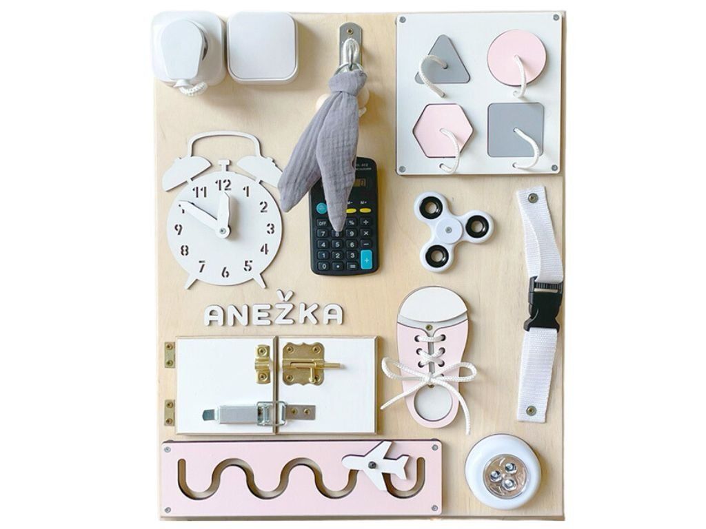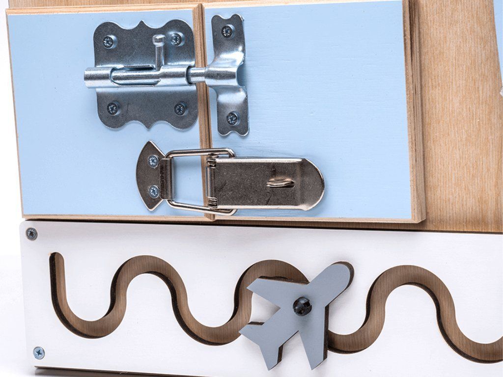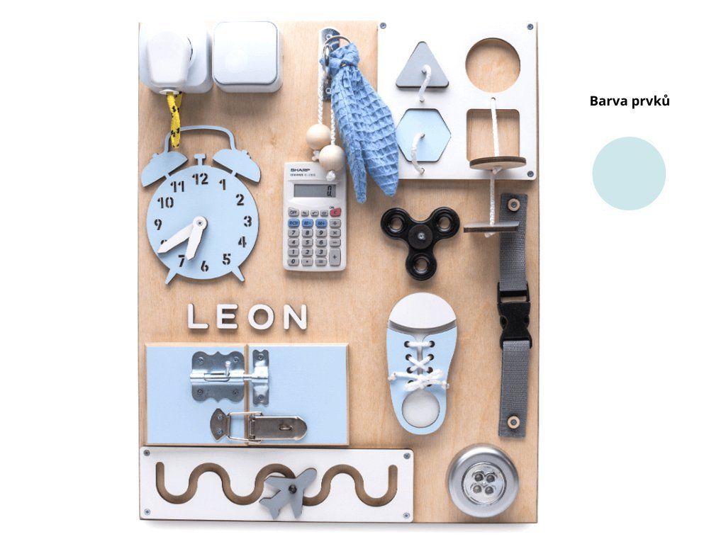 | Tabuľa obsahuje:: | 20 prvkov - kontakt so zástrčkou, prepínač, páska so sponou, rukoväť, drevené gule, topánka na zaväzovanie, hodiny, kalkulačka, spinner, okrúhle svetlo, štvorcové dvere, západka, zámok, štvorcový triedič 4 prvkov, samolepky, .. |