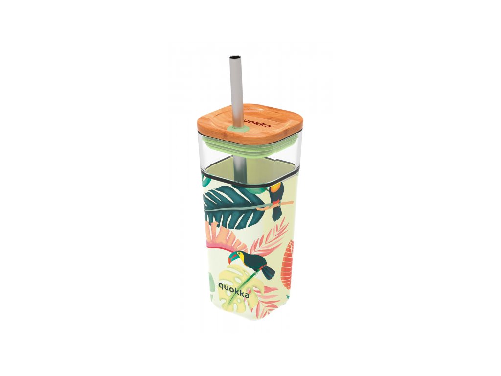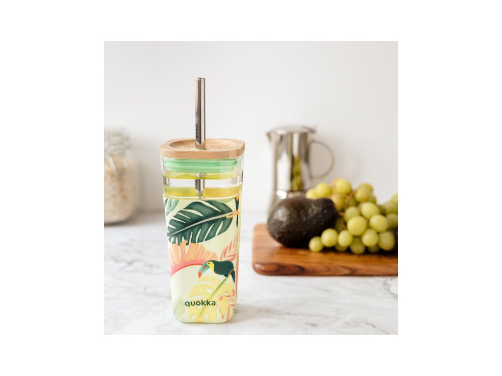 Sklenený cestovný hrnček Quokka Liquid Cube s kovovou slamkou je vybavený spoľahlivým tesniacim viečkom z bambusu a silikónu. Protišmykový silikónový návlek uľahčuje a spríjemňuje držanie hrnčeka.