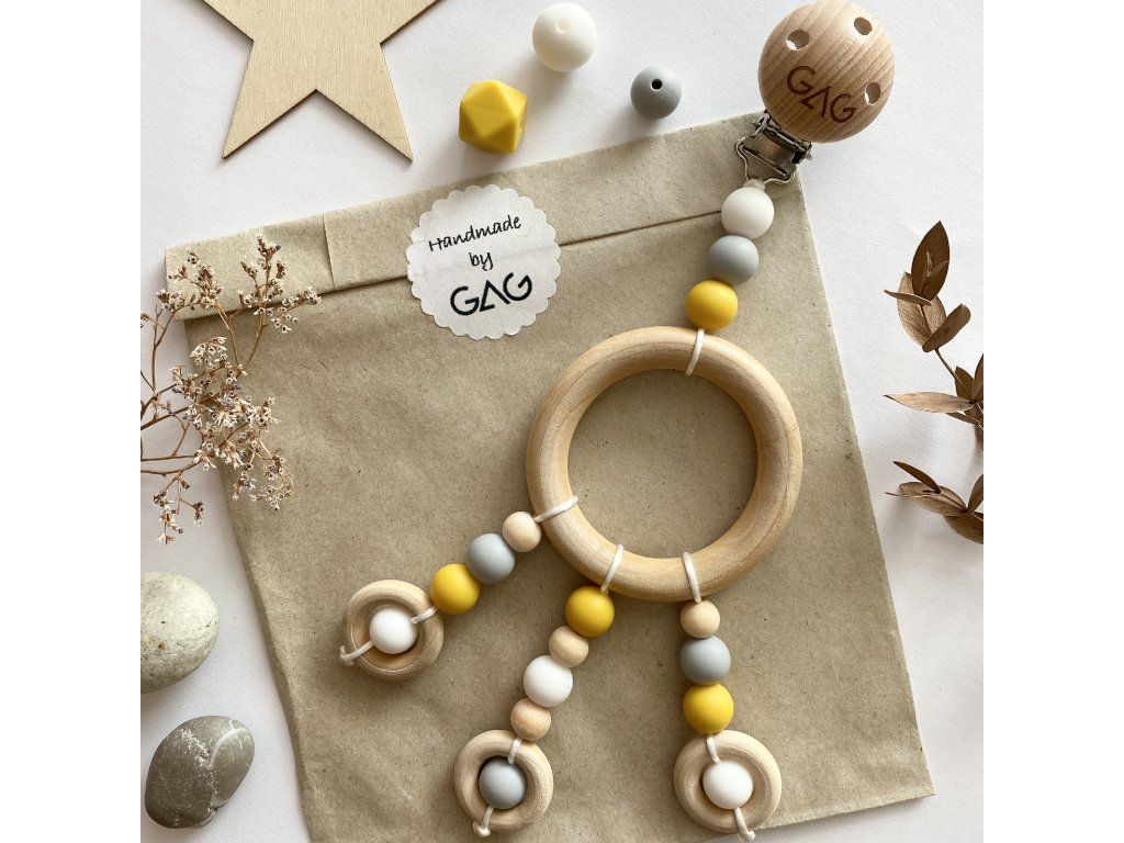 - Záveska na kočík je vyrobená z prírodného dreva, potravinárskeho silikónu, nylonovej šnúry a kovových rukovätí.