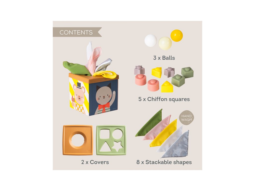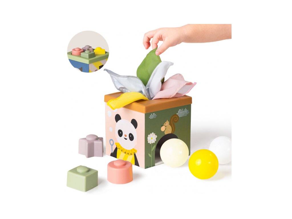 Multifunkčný box s rôznorodými aktivitami je navrhnutý tak, aby podnecoval detskú zvedavosť, podporoval samostatné hranie a rozvíjal jemnú motoriku i kognitívne zručnosti dieťaťa. Vďaka farebným šatkám, senzorickým loptičkám a tvarom na skladanie si deti od 12 mesiacov užijú hodiny zmysluplnej zábavy.
