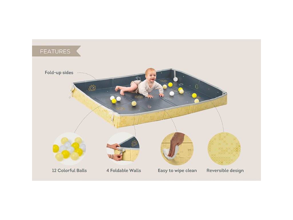 Extra veľká, obojstranná penová hracia deka vyniká svojou univerzálnosťou a pohodlím pre vás aj vaše dieťa od narodenia. Jedinečné zdvihnuté okraje vytvárajú bezpečnú, uzavretú hraciu plochu, udržujú hračky a loptičky na deke a poskytujú bábätku pocit bezpečia. Starším deťom okraje ľahko položíte, aby ste maximalizovali plochu na hranie.