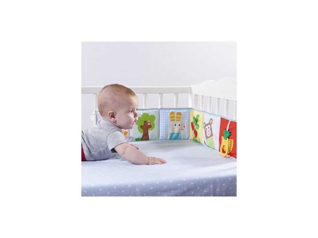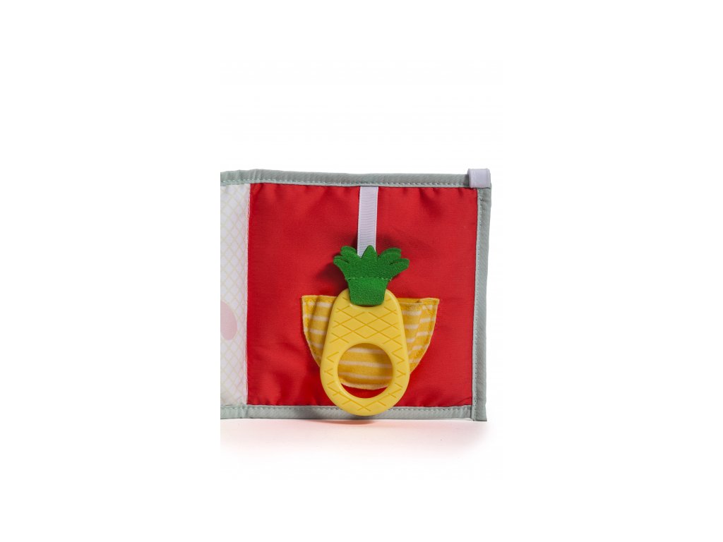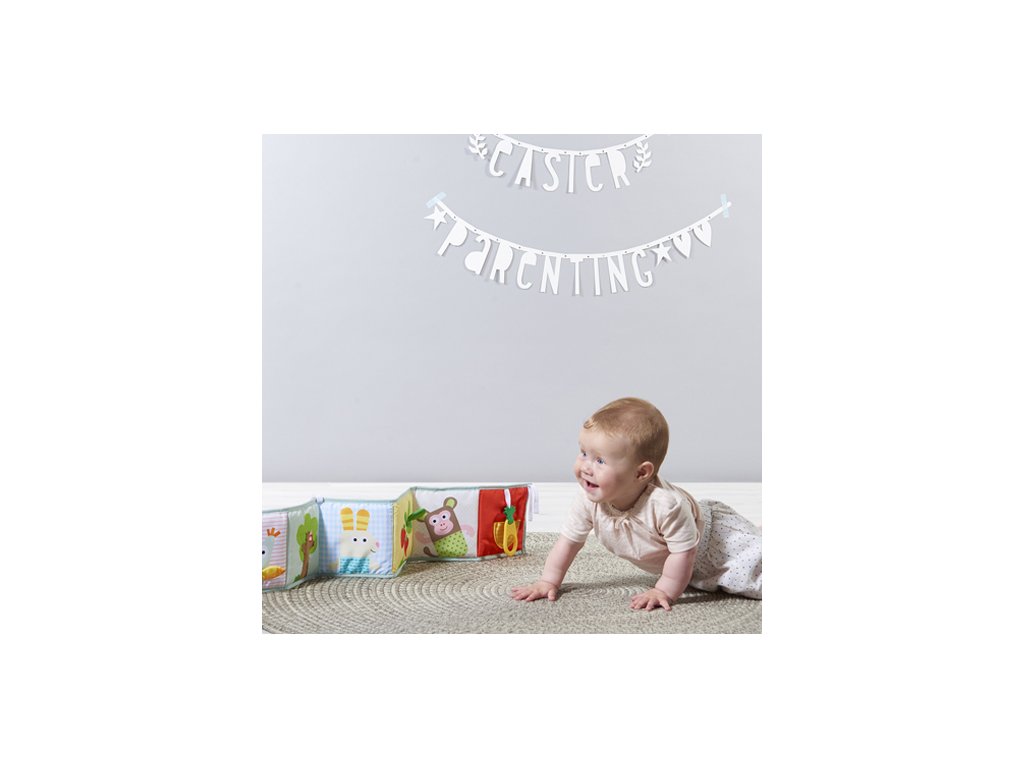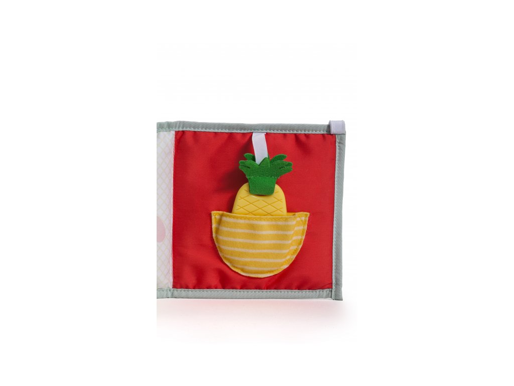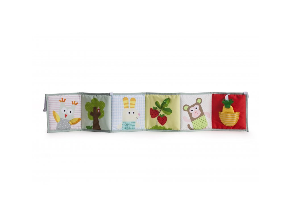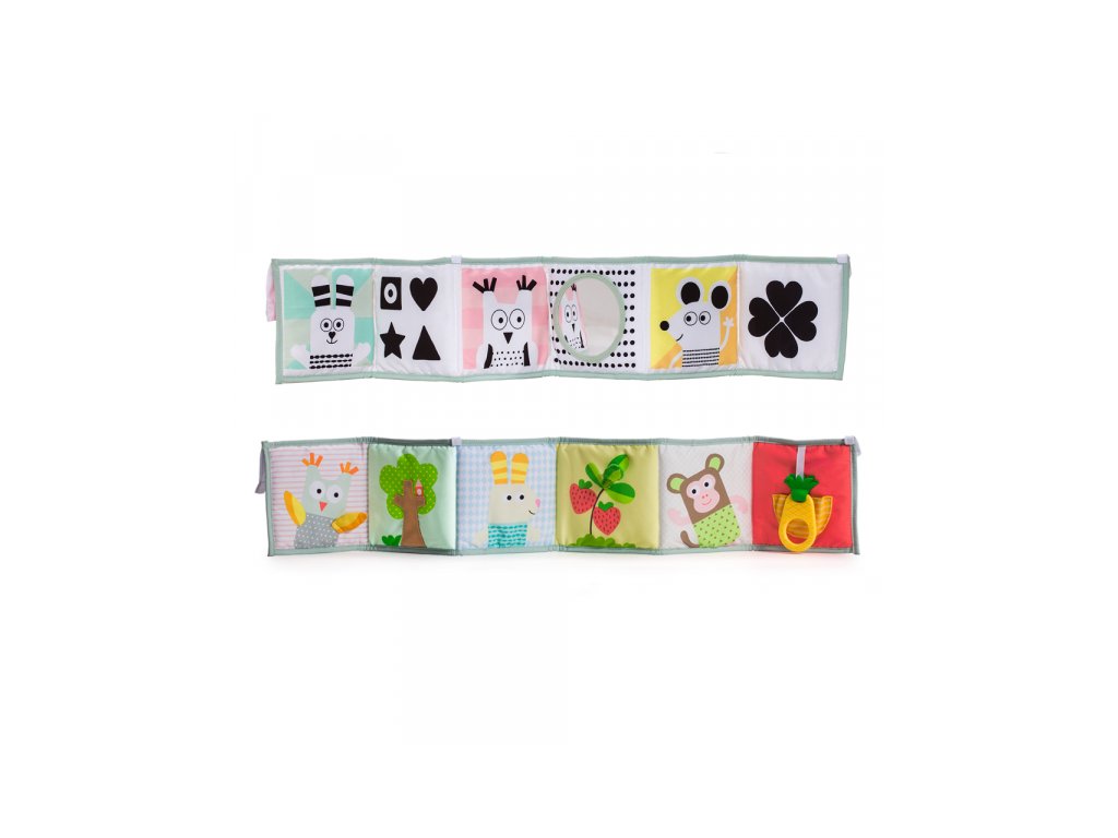 - Od 3 mesiacov: strana s farebnými obrázkami a rôznorodými textúrami na skúmanie, ktoré podporujú rozvoj zmyslov a jemnej motoriky dieťaťa.