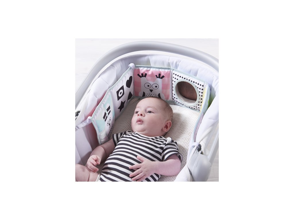 - 0-3 mesiace: strana s bezpečným zrkadielkom a vysoko kontrastnými obrázkami v základných farbách, ktoré podnecujú rozvoj zmyslov a emočnej inteligencie dieťaťa.