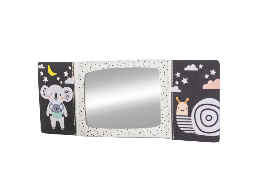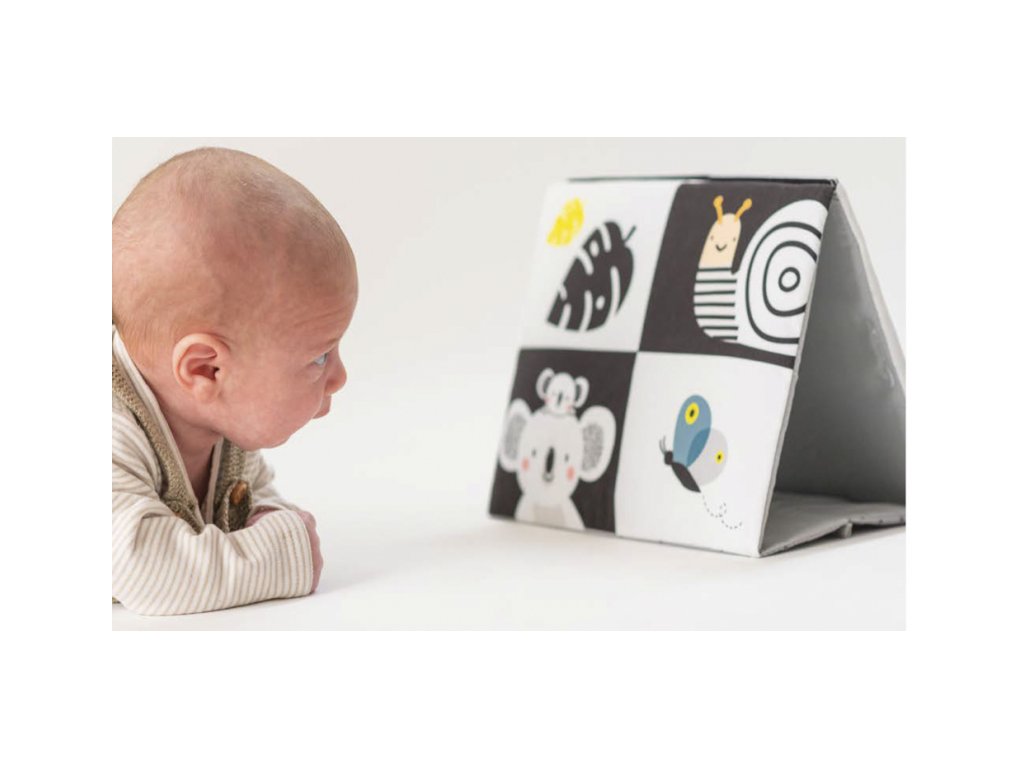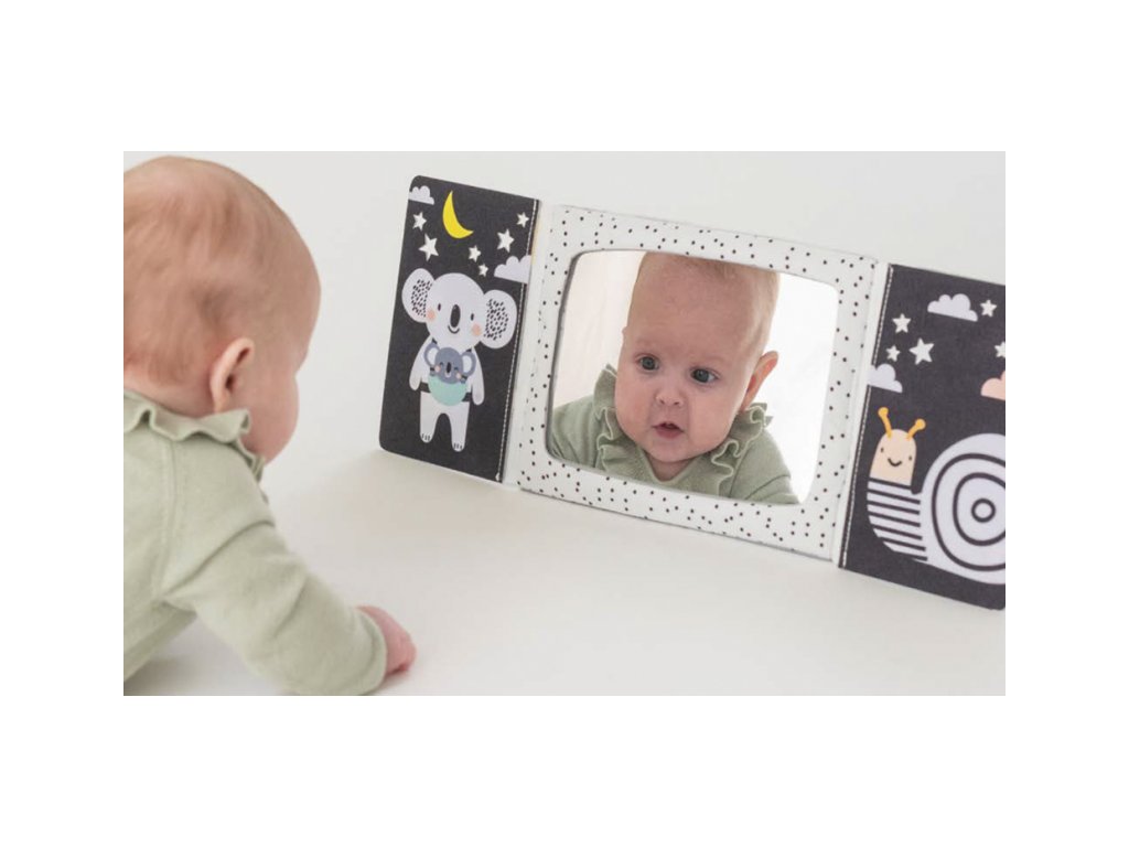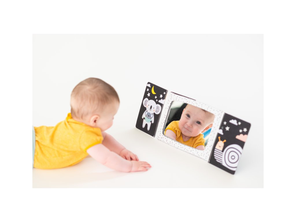 Textilná knižka v tvare stolného kalendára je ideálna pre postavenie pred dieťa pri hre na brušku. Neodolateľné vysoko kontrastné obrázky a bezpečné veľké zrkadlo upútajú pozornosť dieťaťa a pomáhajú tak zabaviť dieťa pri hre na brušku.