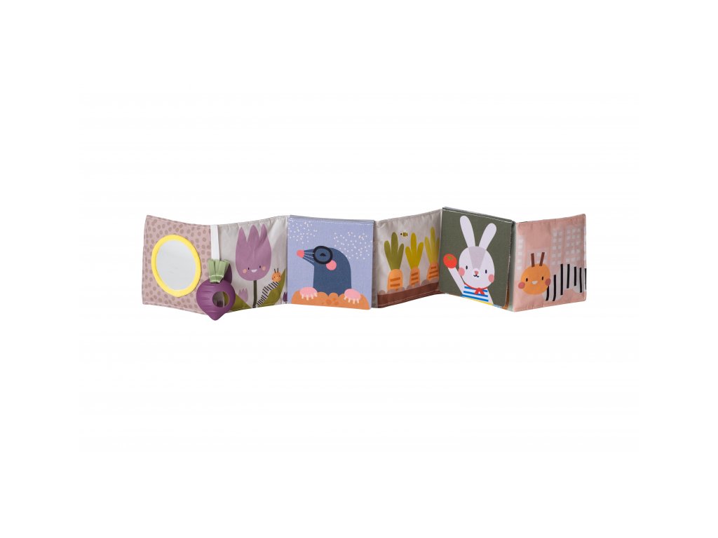 Knižka drží postavená samostatne pre hru na brušku alebo je možné ju pripevniť pomocou plastových klipov na postieľku či do kočíka.