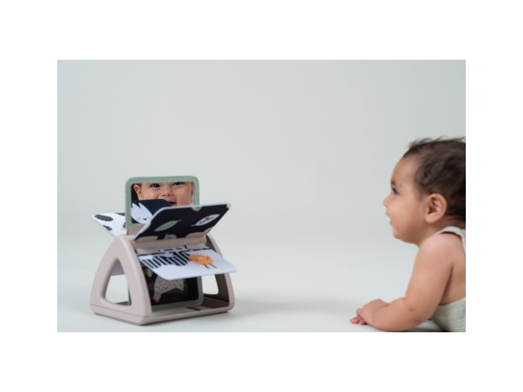 - Od 2 měsíců: výrazné obrázky, bezpečné zrcátko, hologramový třpytivý obrázek a chrasticí zvuk při otáčení jednotlivých stránek upoutají pozornost dítěte při hře na bříšku