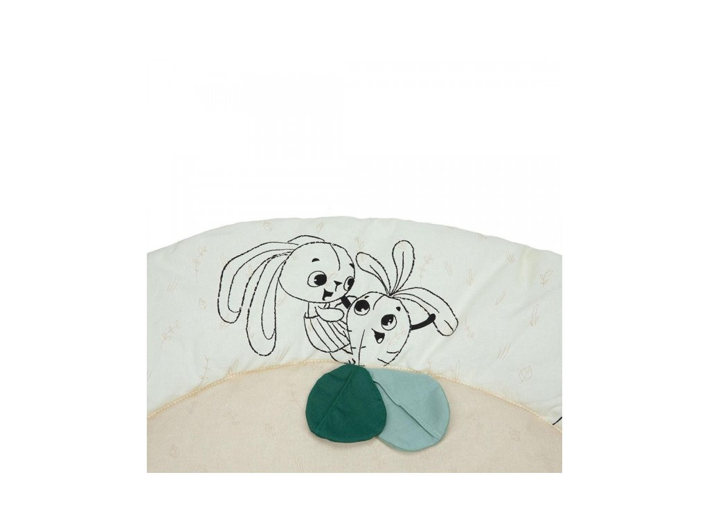 Odnímateľná drevená hrazda umožňuje zavesenie hračiek v podobe chrastiacej repy, rozkošného zajačika a mrkvičky s krúžkom na uchopenie. Priamo na deke nájdete textilné aplikácie s rôznymi textúrami na skúmanie.