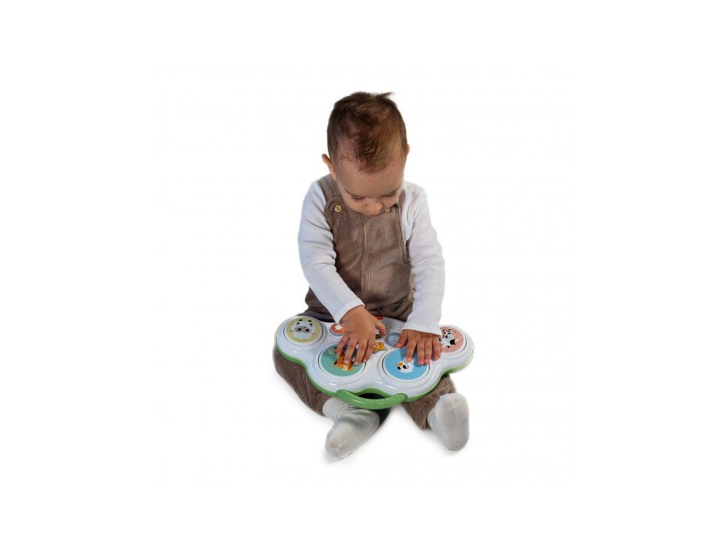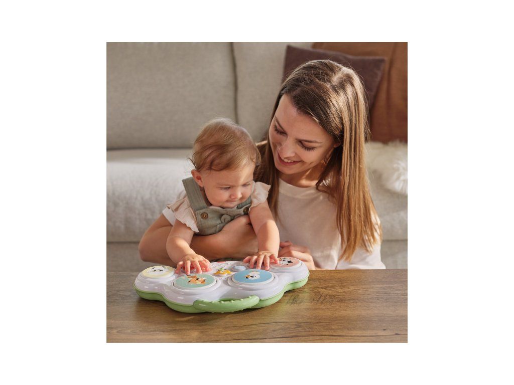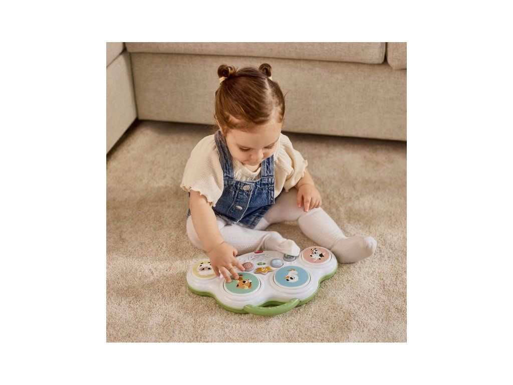 Hudobný pult s bubienkami Tiny Love Farmers Funday deťmi zábavnou formou motivuje k objavovaniu zvukov, rytmu aj zvieratiek. Štyri bubienkové plochy a svetelné tlačidlá spúšťajú bubnové rytmy, vtipné zvuky i farmárske zvieracie efekty, takže hra dieťa dlho udrží v pozornosti. Skvele sa hodí aj na hru na brušku – pomáha predlžovať dobu hrania na brušku, čo podporuje posilňovanie a prípravu na ďalšie motorické míľniky. Zároveň je to ideálna hračka pre spoločné chvíle rodičov s dieťaťom – môžete spolu napodobňovať zvuky, skúšať rytmy a pomenovávať zvieratká.