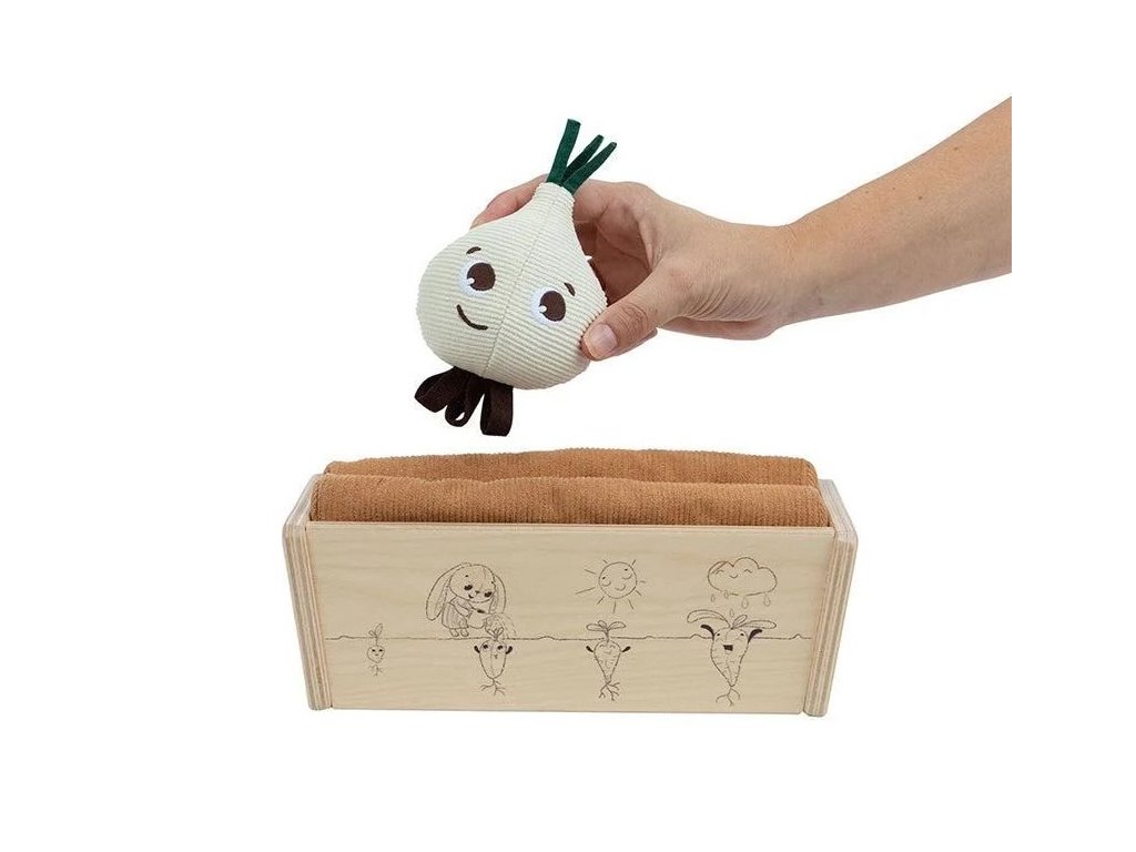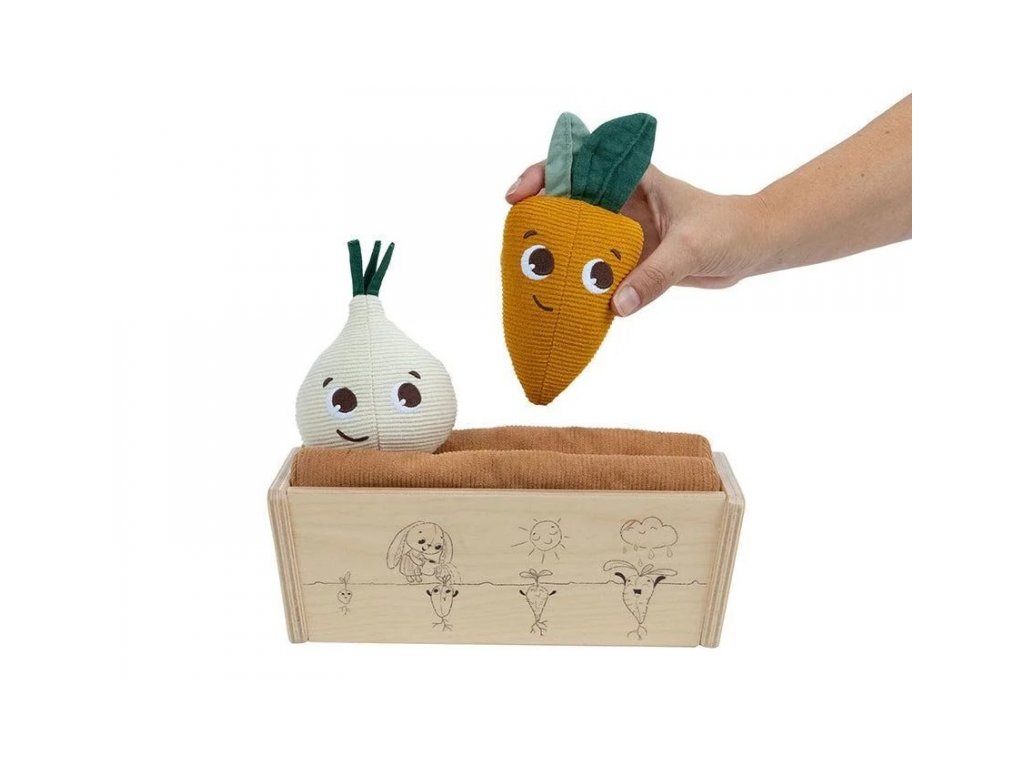 Záhradku tvorí drevený kvetináč, tri kusy zeleniny s veselými tvárami vyrobené z mäkkého textilného materiálu a drevená kanvička.